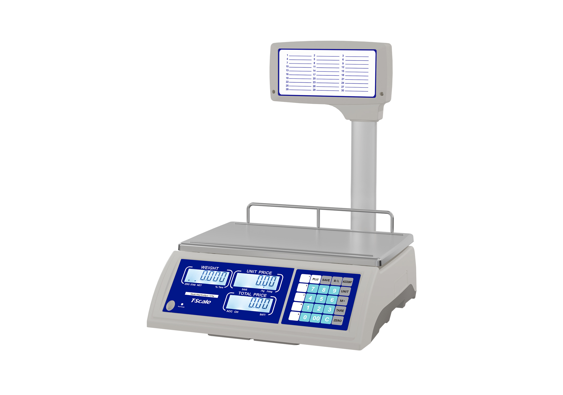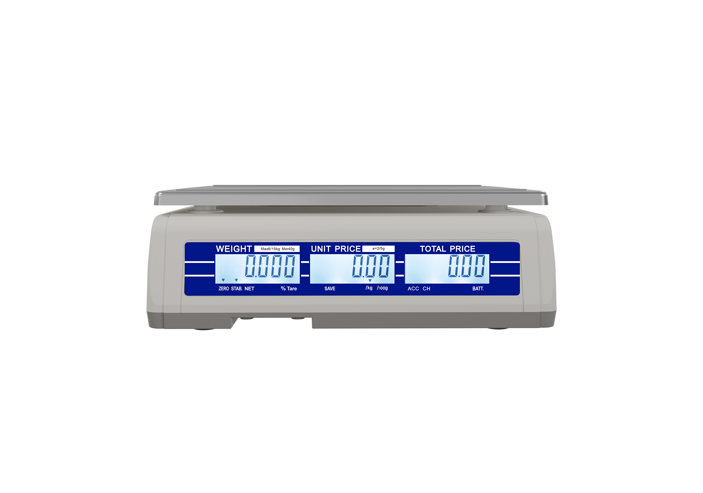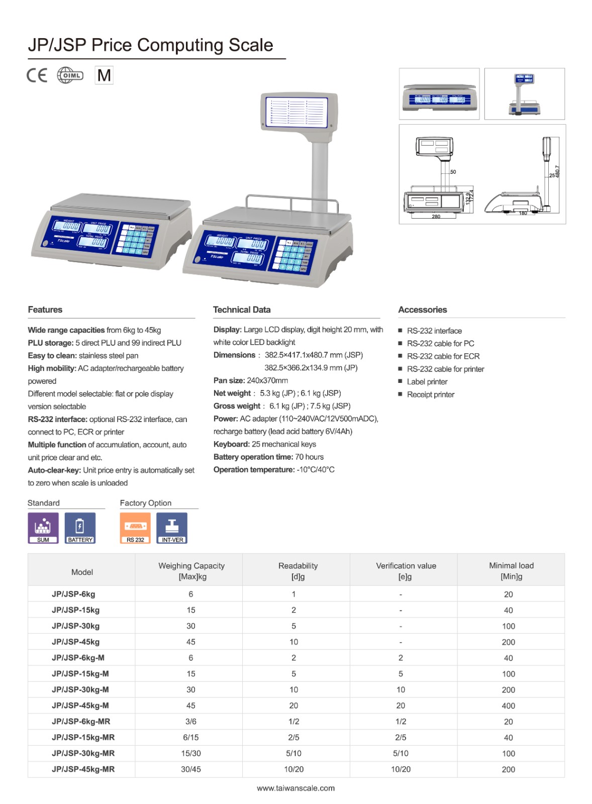 Approval: OIML Capacities:6kg/15kgx2g/5g; 15kg/30kgx5g/10g; 30kg/45kgx10g/20g Pan Size:240 x 370 mm Display:20mm digits LCD display with white LED backlight Key Board:25 keys mechanical Battery: 6V/4Ah Lead-acid rechargeable battery up to 70 hours continuous use (without backlight) Optional: RS232
